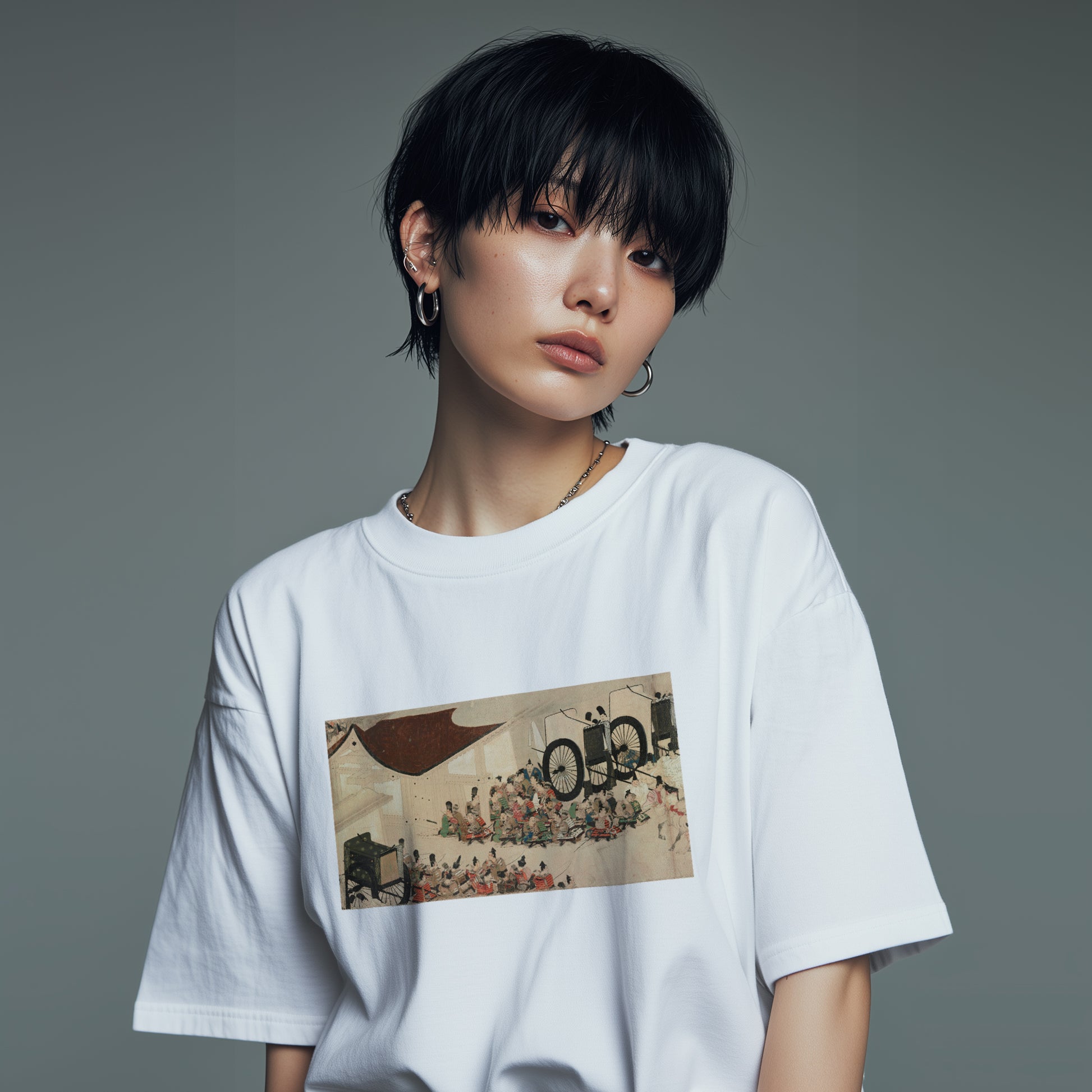 This long narrative scroll, created in the Kamakura period, depicts the Heiji Rebellion of 1159, a major conflict at the end of the Heian period. This scene focuses on Emperor Nijō, who, after being held captive by Minamoto no Yoshitomo and others, escapes the palace disguised as a court lady and is received at Taira no Kiyomori’s residence in Rokuhara. While the lines are not overly decorative, the vivid colors are a distinctive feature.