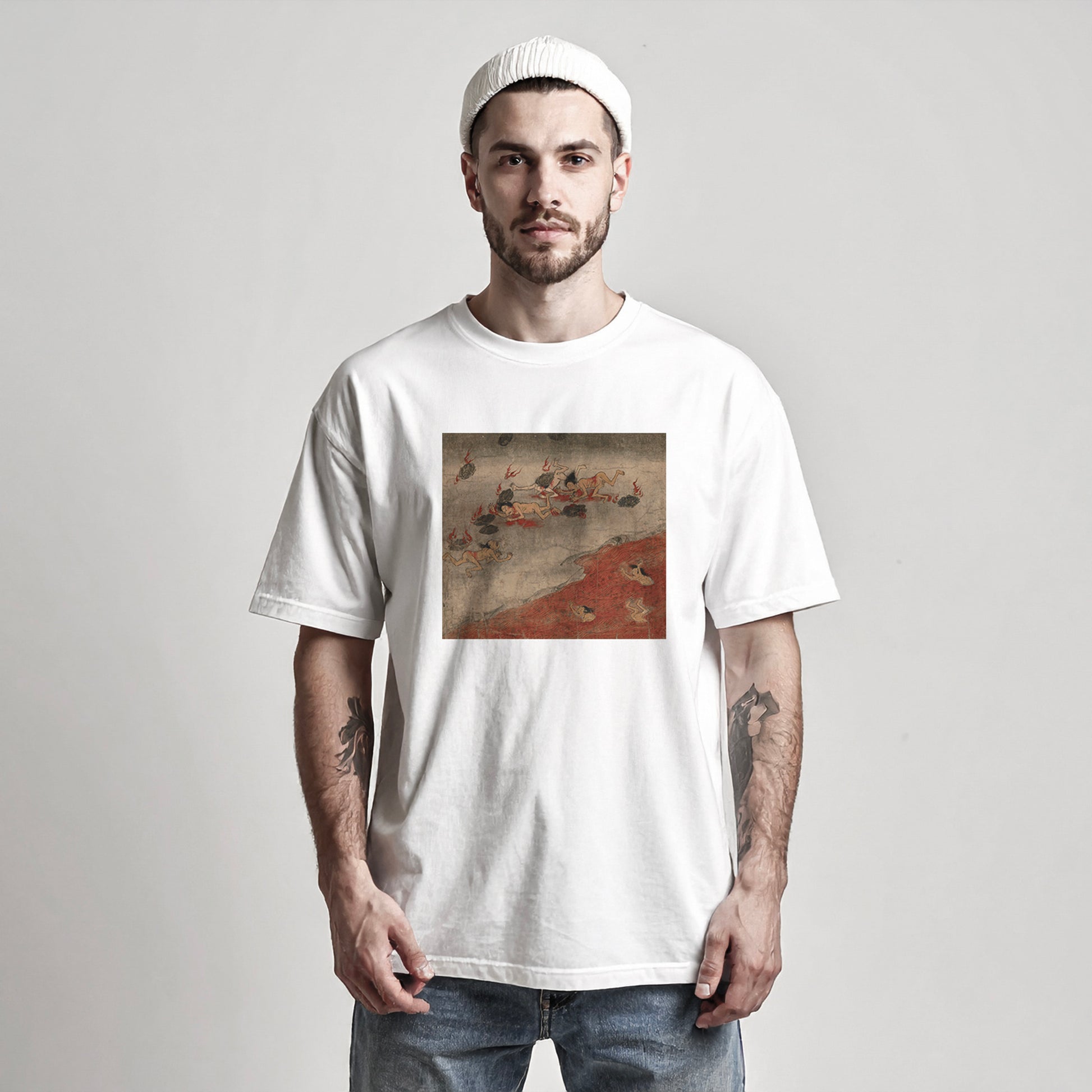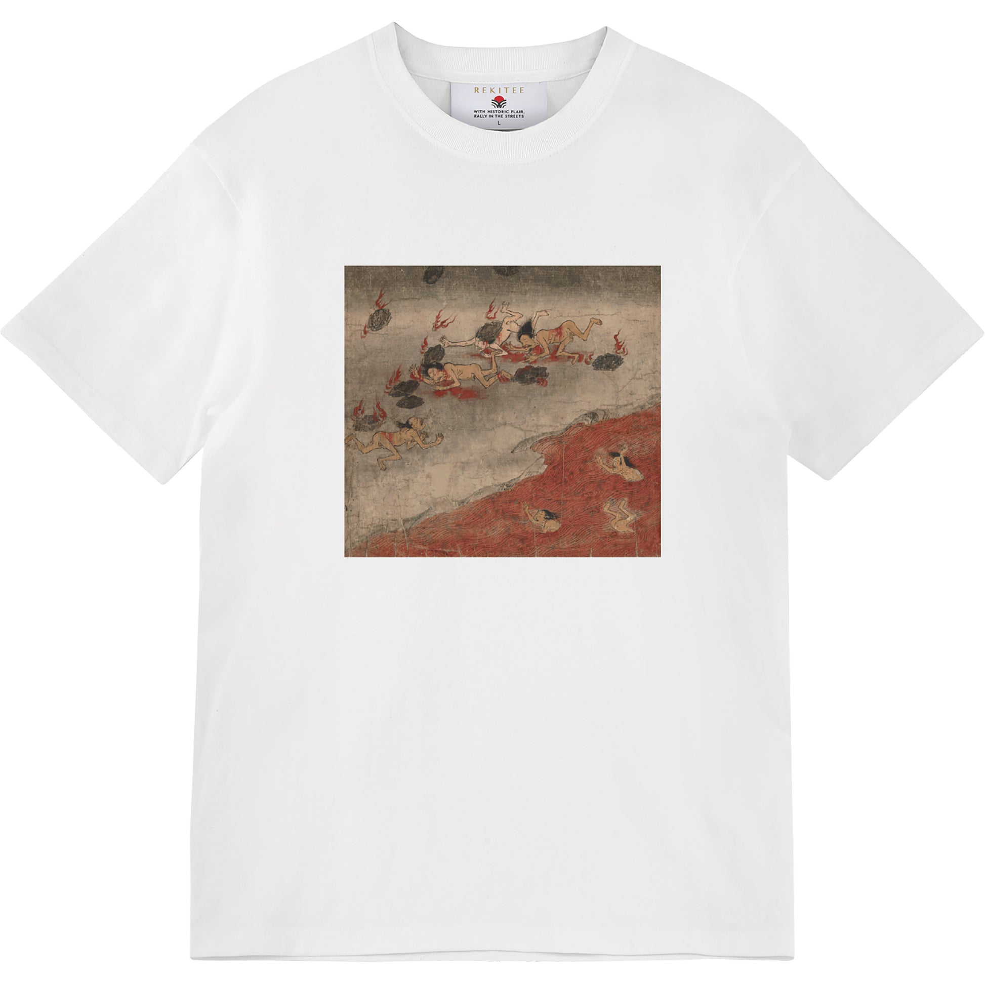 This 12th-century handscroll depicts "Uen Kaseki," a hell where those who commit sins such as killing, theft, and sexual misconduct are condemned. It also punishes those who get travelers drunk, rob them of their possessions, or even kill them. In this realm, burning stones rain down from above, and the sinners are scorched and collapse, unable to escape. Cries of torment echo endlessly from a river of molten metal mixed with hot blood.