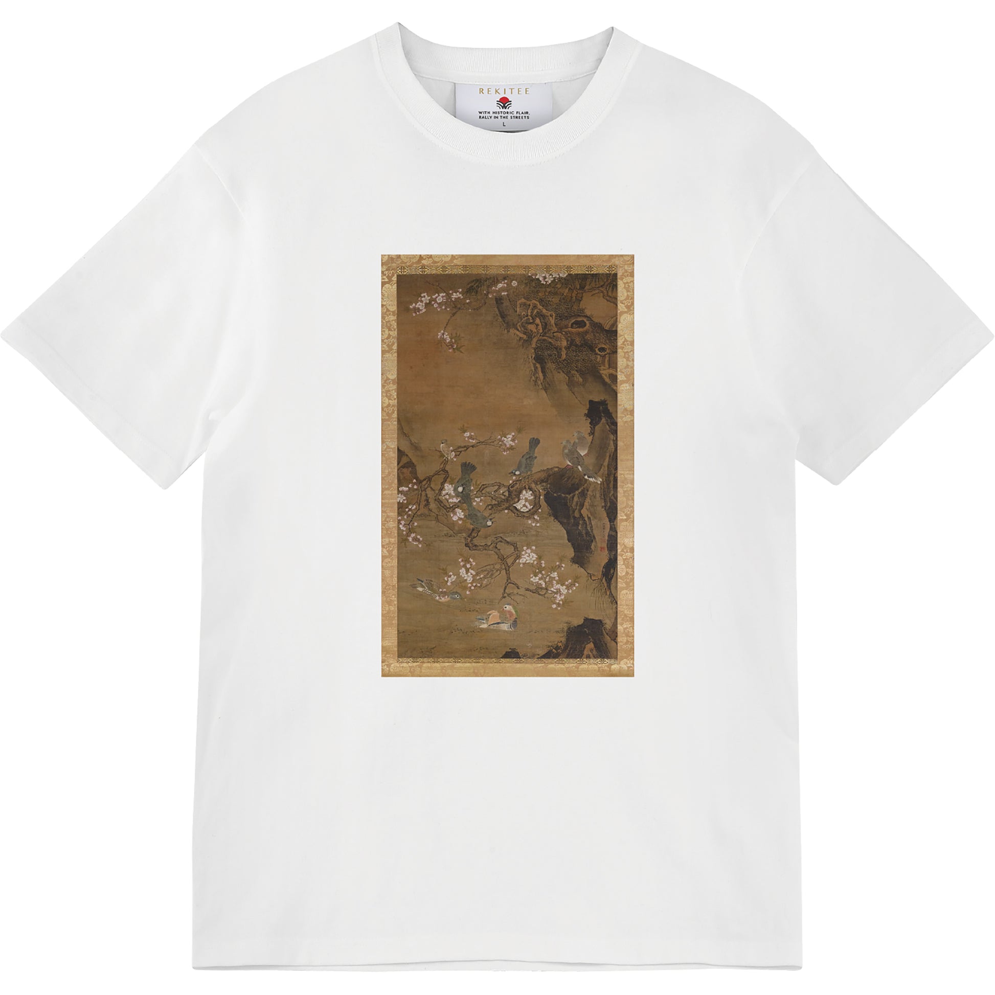 This work represents "Spring" from a four-panel series themed on the four seasons. Peach blossoms bloom in a mountain valley, with birds such as larks, pigeons, mandarin ducks, and black-throated laughing thrushes intricately and vividly depicted on the branches. Considered Lü Ji’s greatest masterpiece, it also influenced Japanese art from the Muromachi period onward.