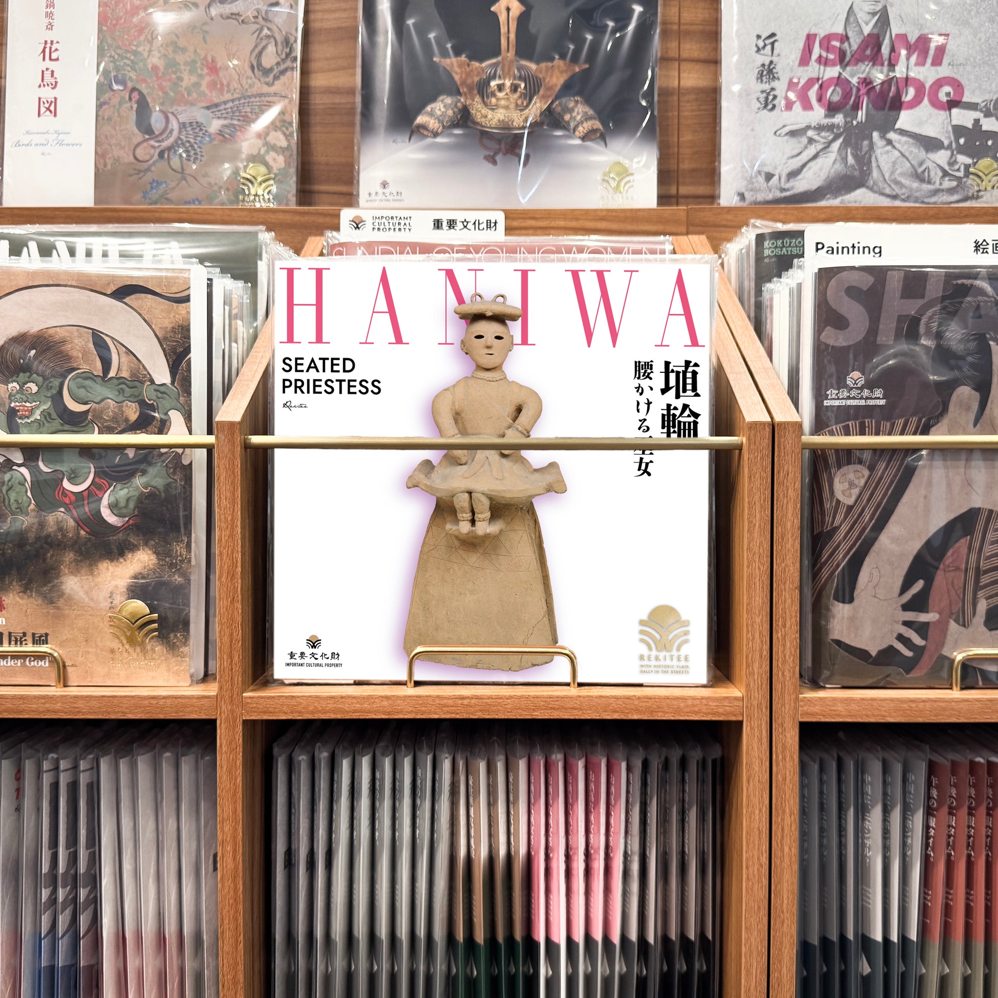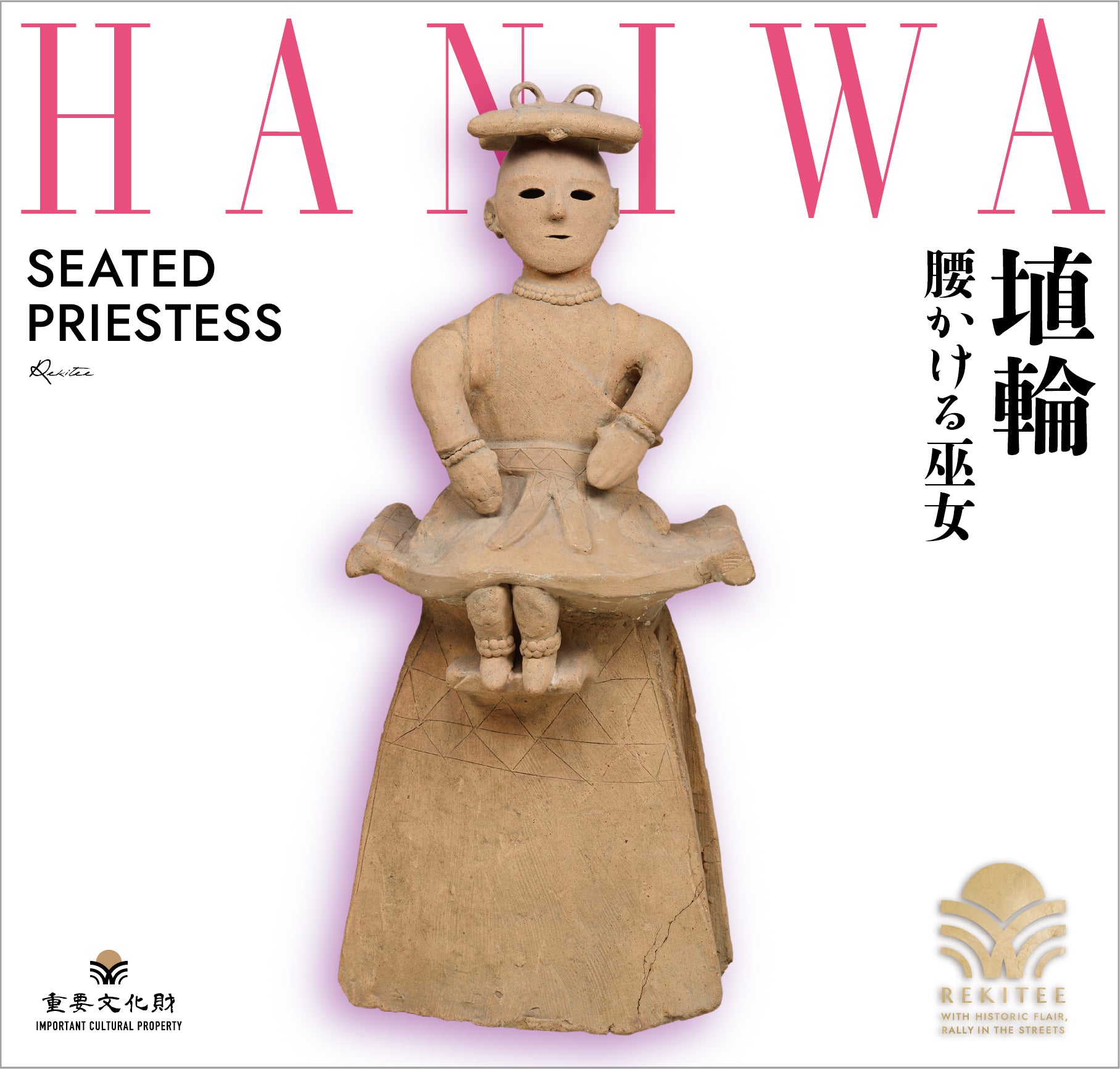 Haniwa are terracotta clay figures created during Japan’s Kofun period. This figure depicts a priestess seated on a rectangular chair, her small feet resting on a flat board attached to it. She wears a large topknot adorned with a vertical comb, along with round bead necklaces, bracelets, and anklets, and likely once had earrings. Dressed in a sash-style robe, she carries a bag with triangular patterns and a five-bell mirror on her left hip.
