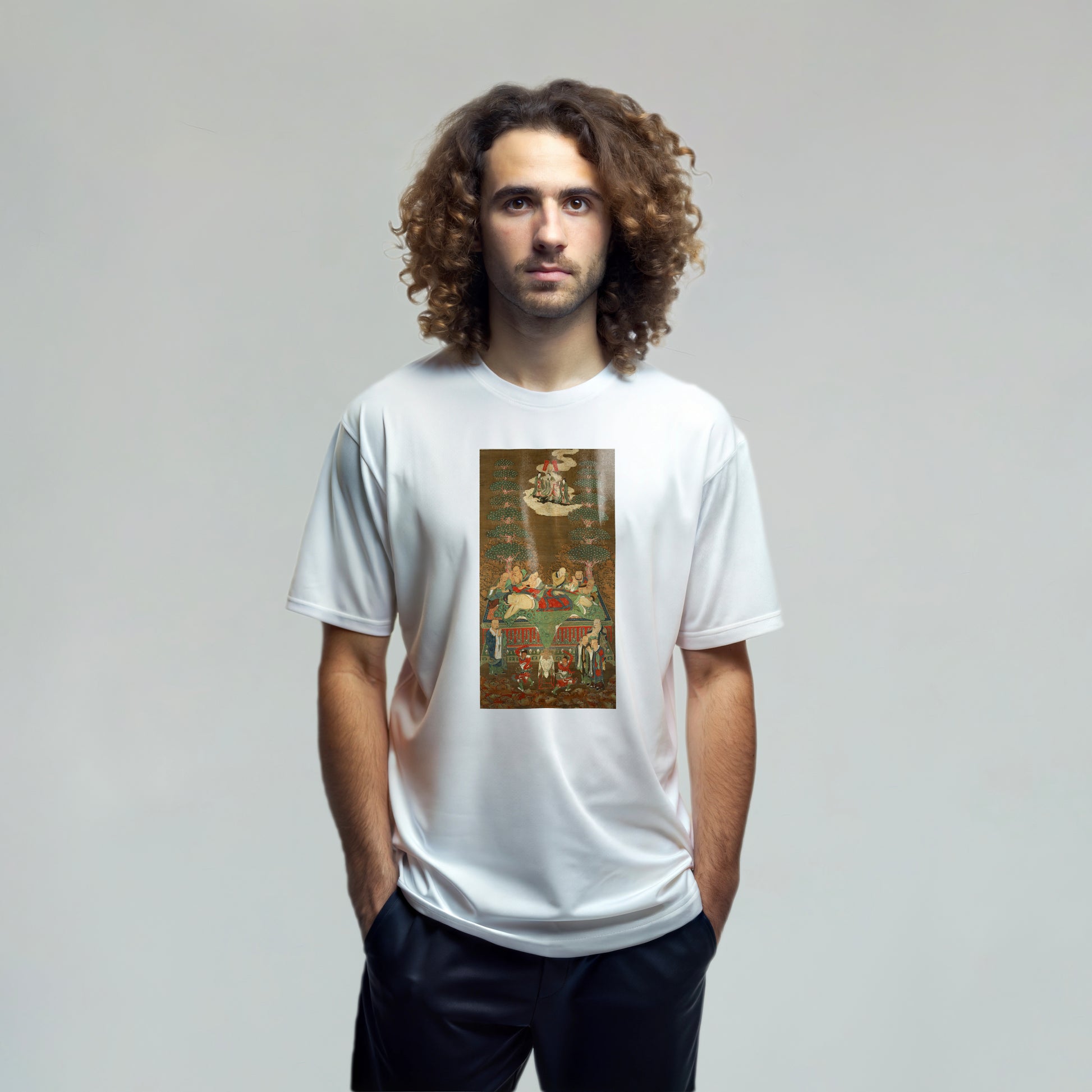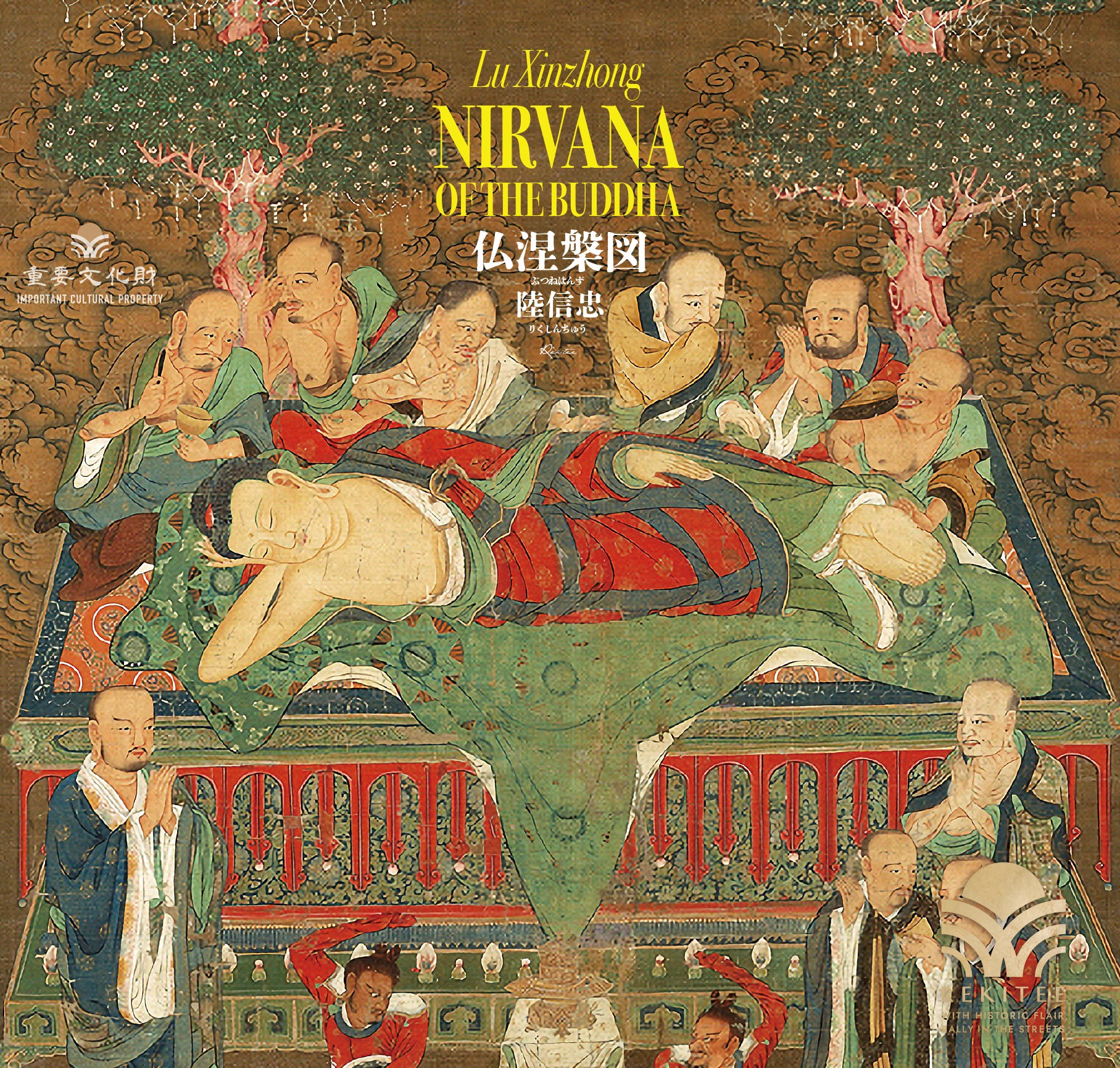 Nirvana represents the Buddha's passing, not as physical death, but as transcending the world through enlightenment. Uncommon for Nirvana paintings, this work depicts sal trees resembling the jeweled trees of paradise. The disciples show little sorrow, and a striking feature is the two figures in a foreign style dancing across a censer, adding a unique touch.